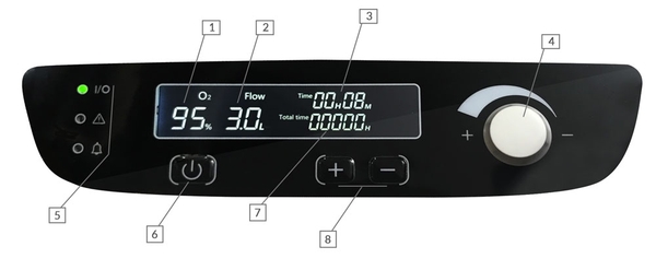 1. Chỉ số nồng độ oxy tinh khiết 2. Lưu lượng oxy ra 3. Thời gian hẹn giờ / Thời gian hoạt động 4. Núm điều chỉnh lưu lượng oxy ra và ký hiệu tăng giảm |